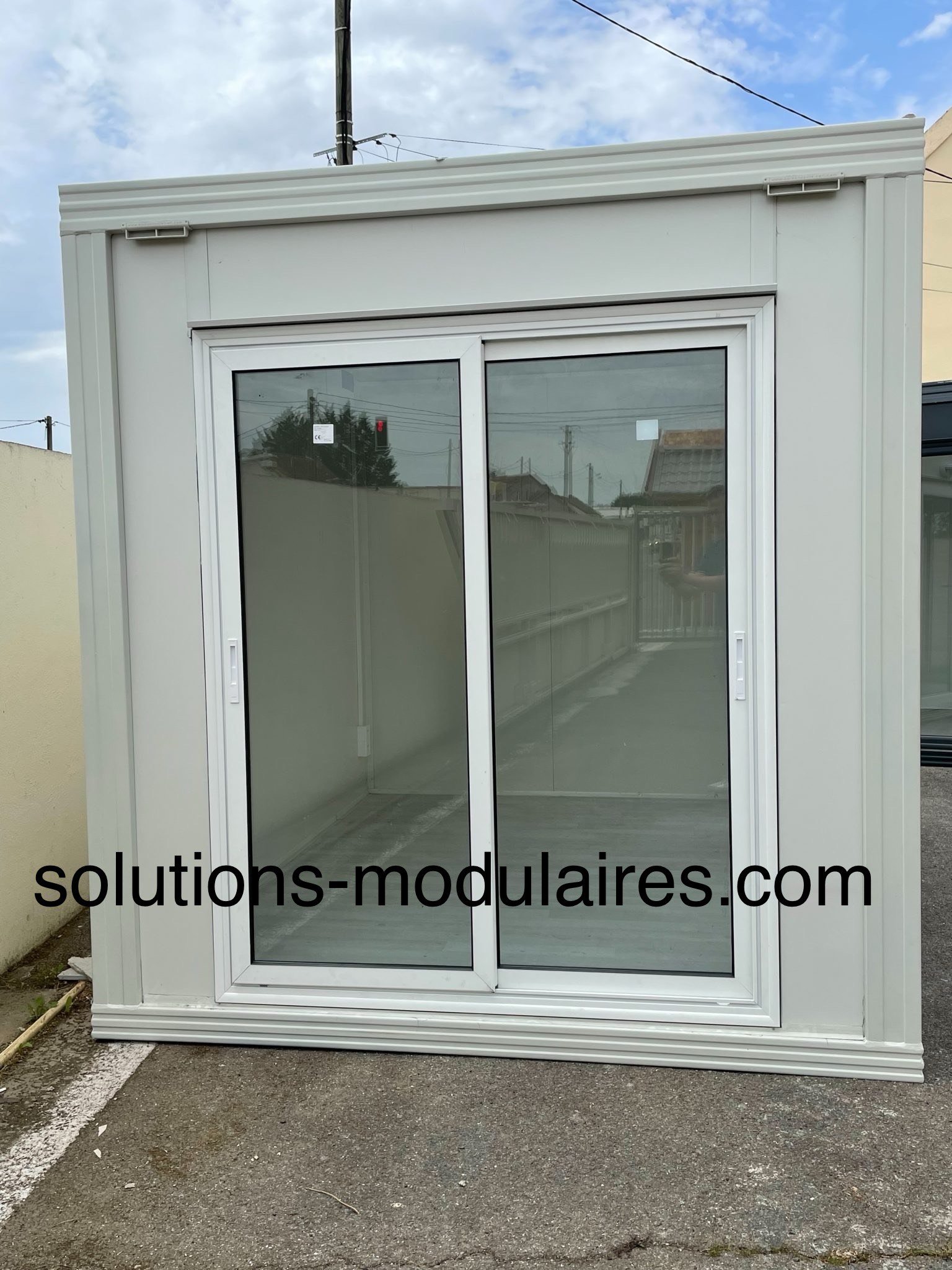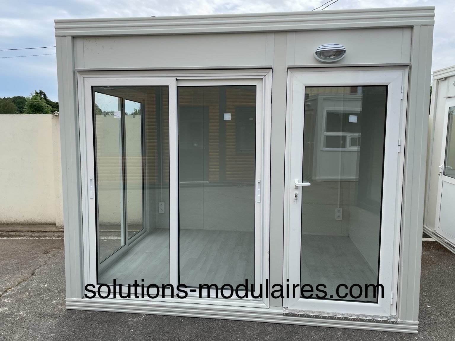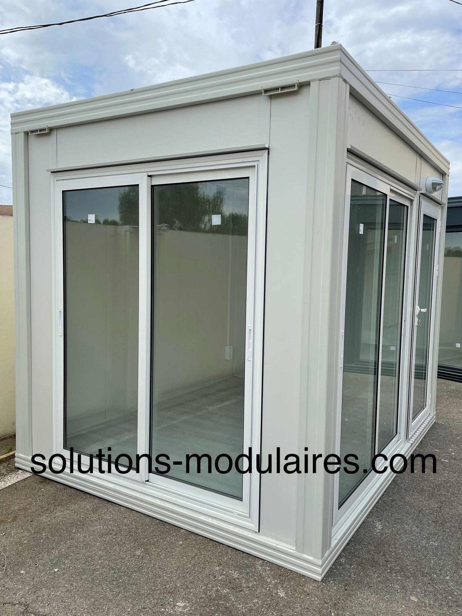 BUNGALOW 3 M x 2.40 M AVEC FACADE ET LATERALE VITREE + 1 PORTE D’ENTREE ALUMINIUM 90CM vitrée + 1 TABLEAU ELECTRIQUE + 1 INTERRUPTEUR + 2 PRISES ELECTRIQUES + 1 LUMINAIRE + SOL EN STRATIFIE.