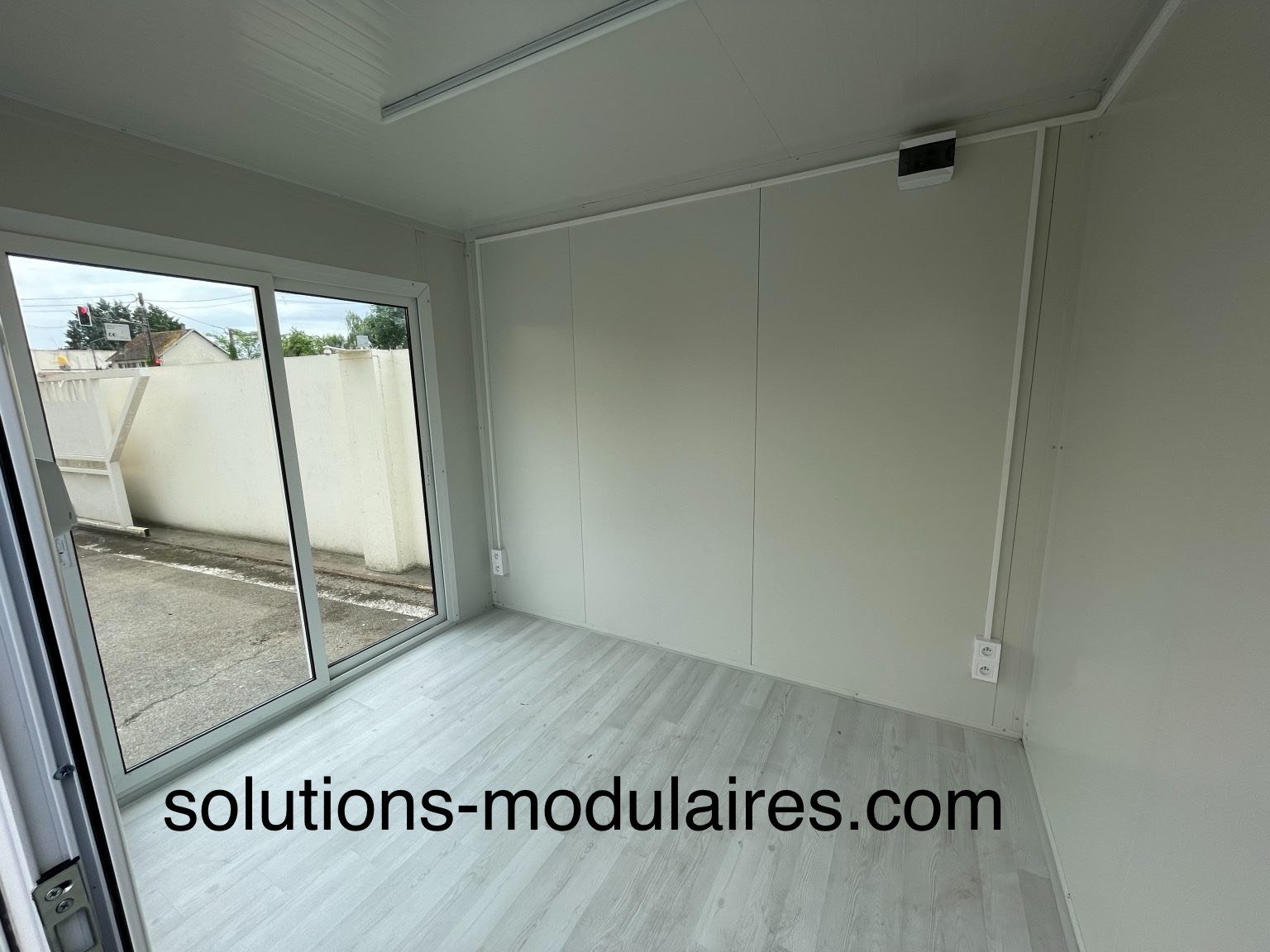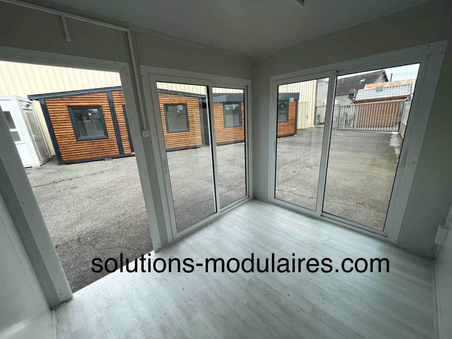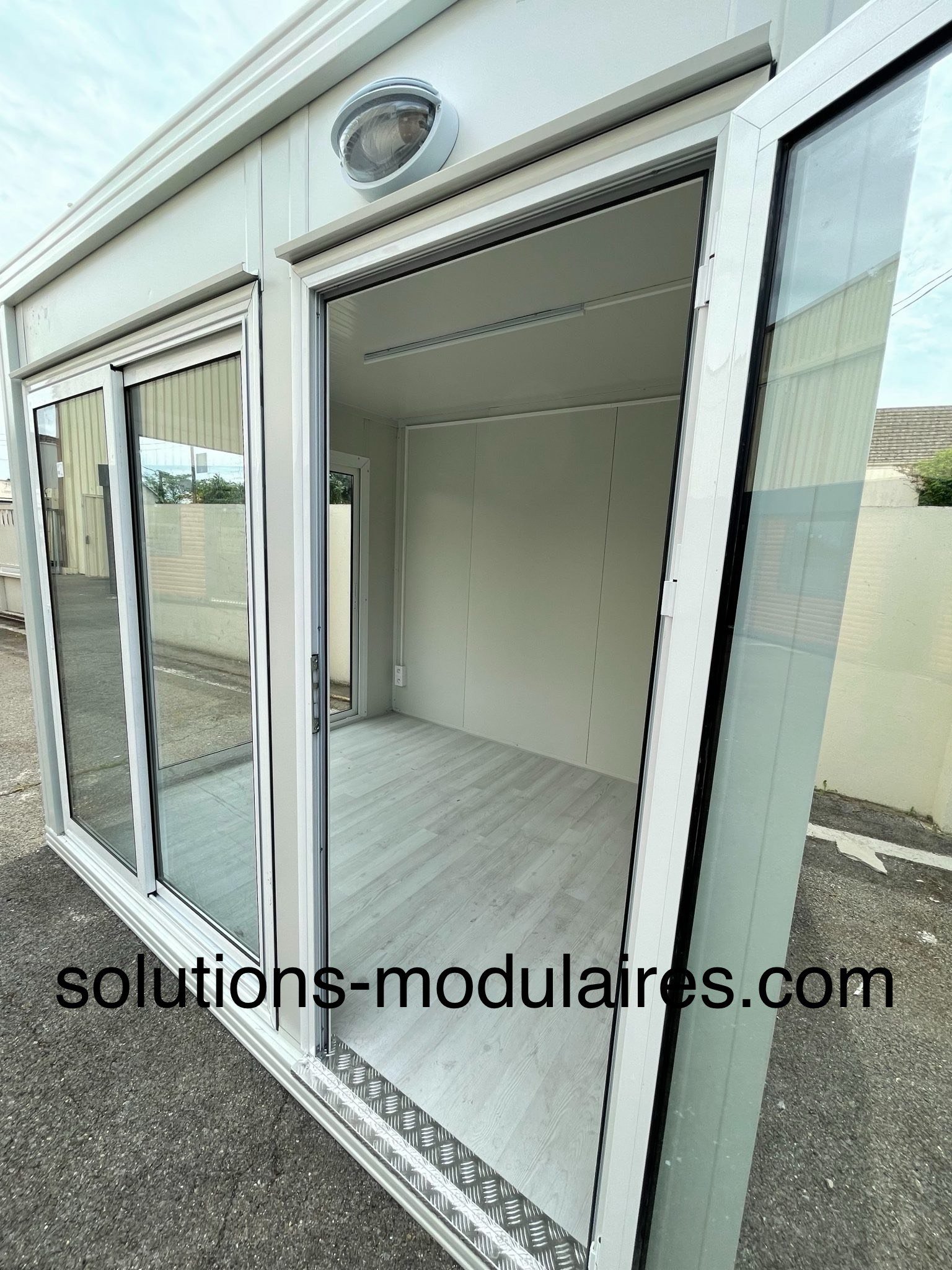 BUNGALOW 3 M x 2.40 M AVEC FACADE ET LATERALE VITREE + 1 PORTE D’ENTREE ALUMINIUM 90CM vitrée + 1 TABLEAU ELECTRIQUE + 1 INTERRUPTEUR + 2 PRISES ELECTRIQUES + 1 LUMINAIRE + SOL EN STRATIFIE.